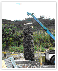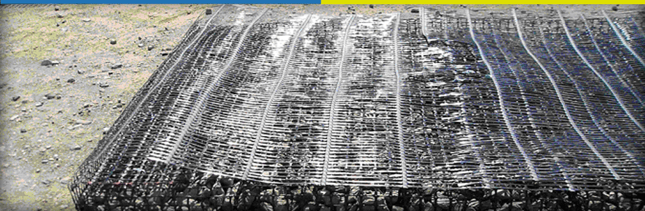 El sistema de Geocolchones está formado por geogrillas estructurales de HDPE, varillas de HDPE y cordel negro con protección UV. Estos elementos se integran con gravas de 3”-6” y su función es el control de socavación marina y protección de cursos fluviales |